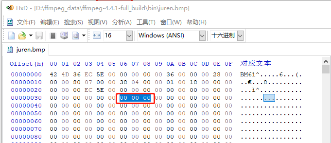 由于 BMP 格式比较简单,所以使用 HxD 即可,这是一个 16进制查看器,功能非常强大,用 HxD 打开 juren.bmp 图片,如下: