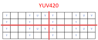 3,直接丢弃 第二,第三,第四个像素的 U值,取 第一个 像素的 U 值。V值同理。
