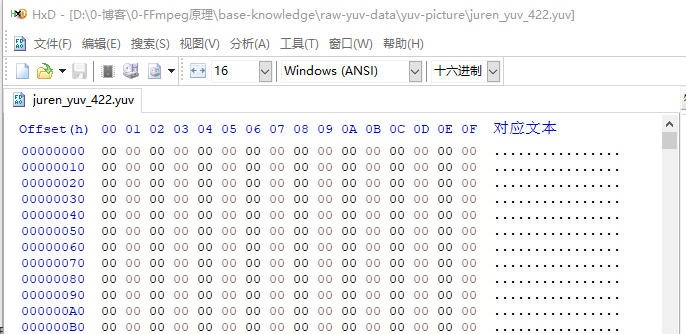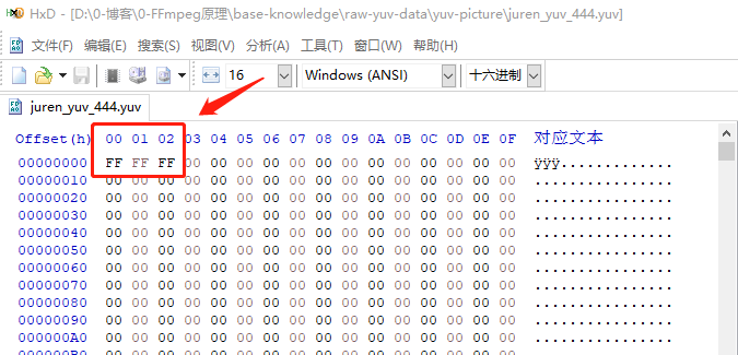 先用 HxD 来看一下 juren_yuv_444.yuv 图片 实际的存储情况,请看下图: