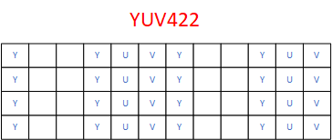 所以,422 格式,是第一第二个像素共享 一组UV,第三第四像素共享 一组 UV,以此类推,如下图: