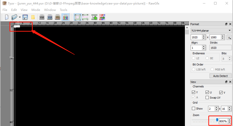 用 7yuv 放大图片查看,左上角果然出现了 3个白色像素。